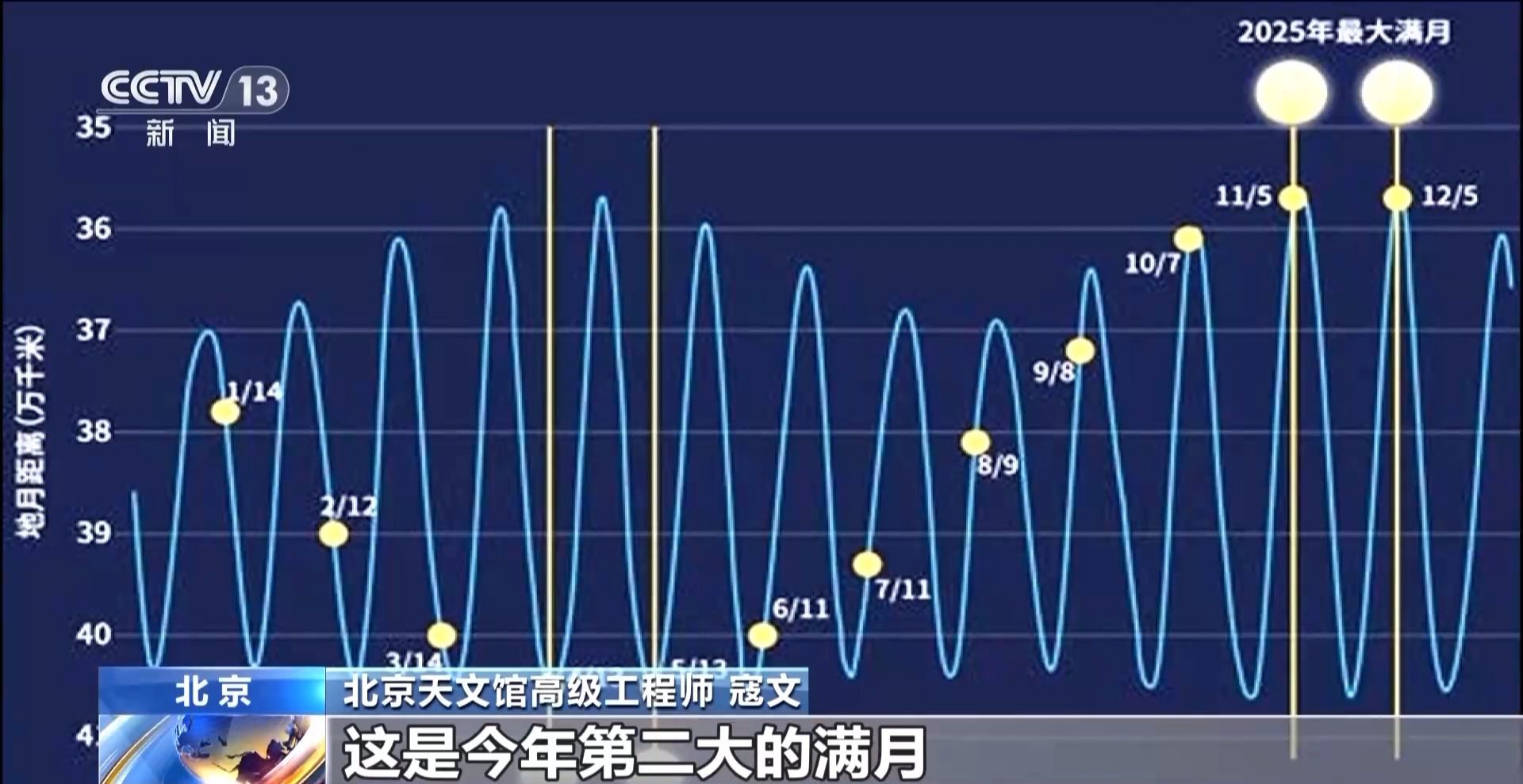 北京天文館高級工程師 寇文:12月5日大約早晨7點14分是滿月,而月亮過近地點的時間是在這之前大約12個小時,這是今年第二大的滿月,也可以算是一次“超級月亮”。