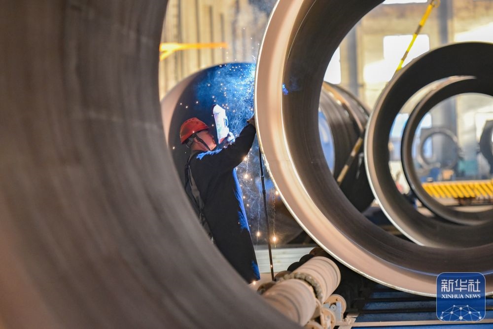 ↑ 12月15日,在山東省青州市益都街道一家大型風(fēng)電設(shè)備制造企業(yè),工人在車(chē)間內(nèi)進(jìn)行焊接作業(yè)。新華社發(fā)(王繼林?jǐn)z)