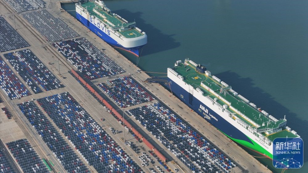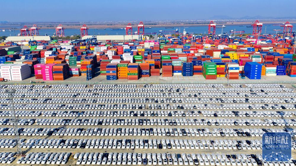 ↑ 12月14日在江蘇省港口集團(tuán)南京港龍?zhí)都b箱碼頭拍攝的等待裝船出口的國(guó)產(chǎn)汽車(chē)(無(wú)人機(jī)照片)。新華社發(fā)(楊素平攝)