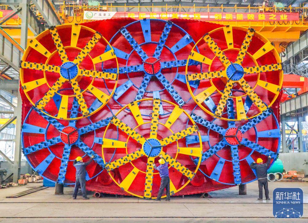 ↑ 12月15日,中鐵科工集團(tuán)武漢江夏制造基地技術(shù)工人對(duì)盾構(gòu)機(jī)配件進(jìn)行裝配作業(yè)。新華社發(fā)(趙軍攝)