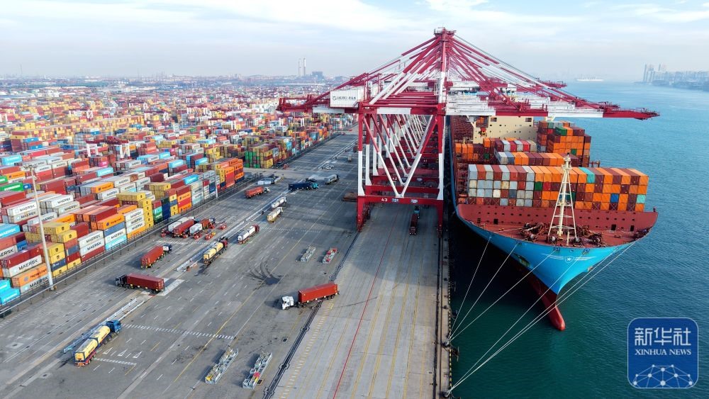 ↑ 12月15日,在山東港口青島港,貨輪在裝卸外貿(mào)集裝箱(無(wú)人機(jī)照片)。新華社發(fā)(俞方平攝)
