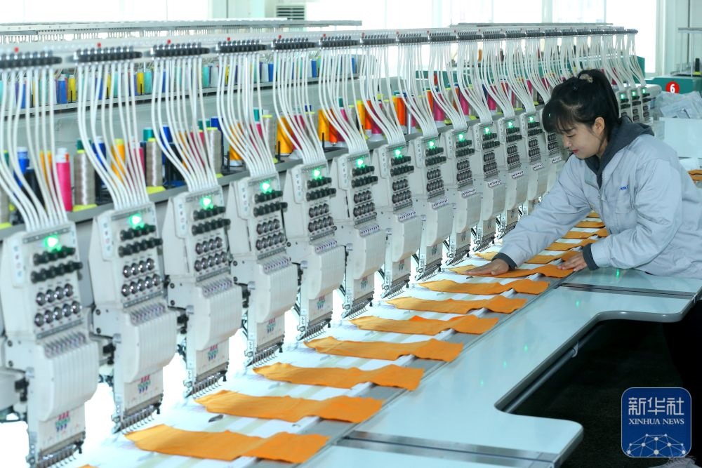 ↑ 12月15日,山東省青島市即墨區(qū)即發(fā)集團(tuán)員工在生產(chǎn)服裝繡花產(chǎn)品。新華社發(fā)(梁孝鵬攝)