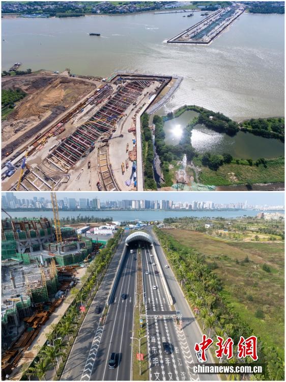 2025年12月18日,海南自由貿易港正式啟動全島封關。近年來,海南自貿港建設在利好政策帶動下不斷刷新“自貿港速度”,一個個重大項目、重點園區(qū)拔地而起,直觀呈現(xiàn)海南自貿港的蓬勃生機。這里正成為中國對外開放的新前沿、互利合作的新熱土和推動經(jīng)濟全球化的新引擎。上資料圖為2019年6月19日的??谖拿鳀|越江隧道施工現(xiàn)場,下資料圖為2025年12月7日已建成通車的海南省首條跨越南渡江隧道——文明東隧道。(拼版圖,無人機照片)