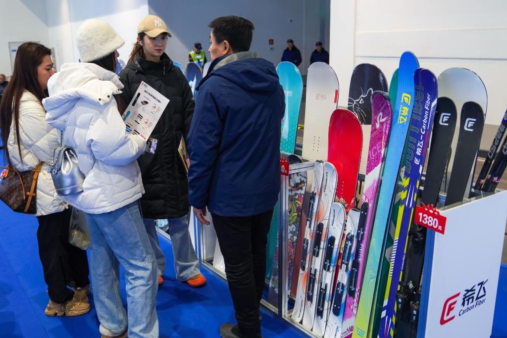 12月18日,參觀者在第九屆吉林冰雪產(chǎn)業(yè)國際博覽會現(xiàn)場參觀展出的國產(chǎn)碳纖維滑雪板。新華社記者 許暢 攝
