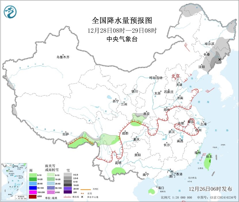 12月28日08時(shí)至29日08時(shí),內(nèi)蒙古東北部、東北地區(qū)北部和東部、西藏東南部、陜西南部、四川中部等地部分地區(qū)有小雪或雨夾雪,其中,吉林東部等地部分地區(qū)有中到大雪(5~7毫米)。西藏東南部、四川中部、云南南部、海南島中部、臺(tái)灣島等地部分地區(qū)有小雨,其中,臺(tái)灣島東部等地部分地區(qū)有中雨。內(nèi)蒙古東部部分地區(qū)有4~6級(jí)風(fēng);南部海域有5~6級(jí)風(fēng),陣風(fēng)7~8級(jí)。