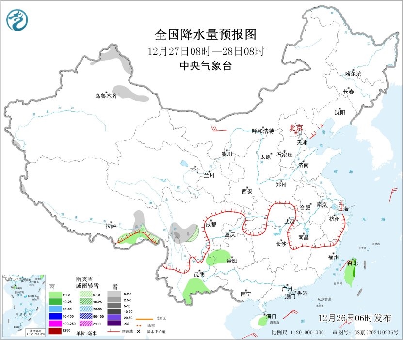 全國(guó)降水量預(yù)報(bào)圖(12月26日08時(shí)-27日08時(shí))