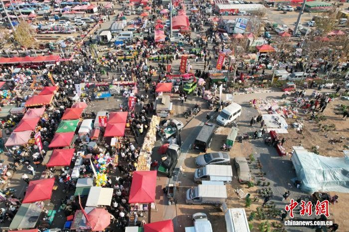 12月8日,山東省臨沂市臨沭縣,民眾暢游曹洼大集。近期,曹洼大集憑借超高性價(jià)比的特色美食、濃郁的民俗氛圍、線上線下聯(lián)動的鮮活場景火爆全網(wǎng)。(無人機(jī)照片) 中新社記者 王峰 攝