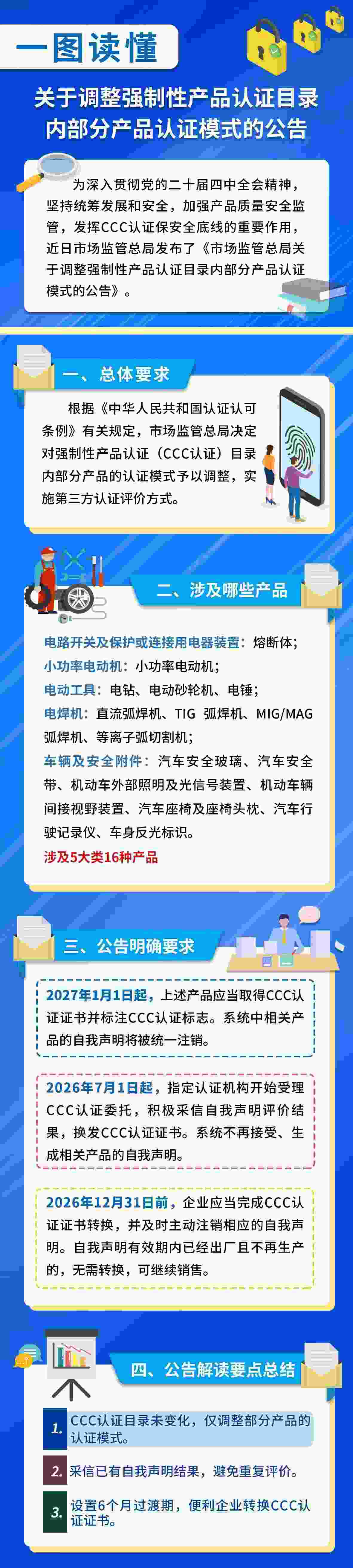 《公告》明確,電動(dòng)工具、汽車(chē)安全部件等16種涉及群眾人身健康安全的產(chǎn)品,CCC認(rèn)證模式由之前的企業(yè)自我聲明調(diào)整為第三方認(rèn)證評(píng)價(jià)方式。