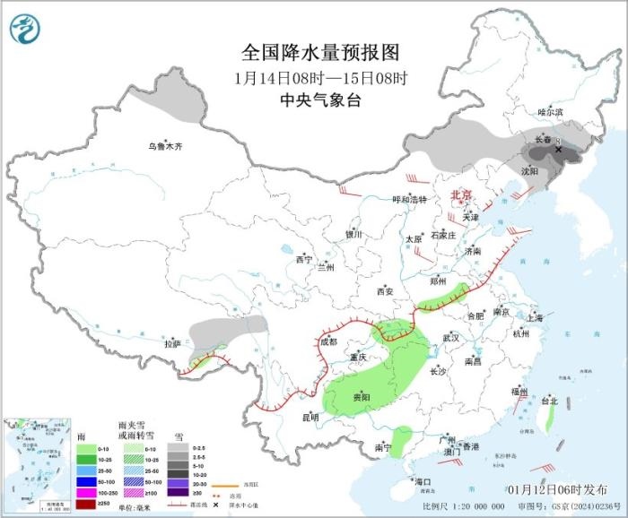 圖4 全國降水量預(yù)報圖(1月14日08時-15日08時)。圖片來源:中央氣象臺網(wǎng)站