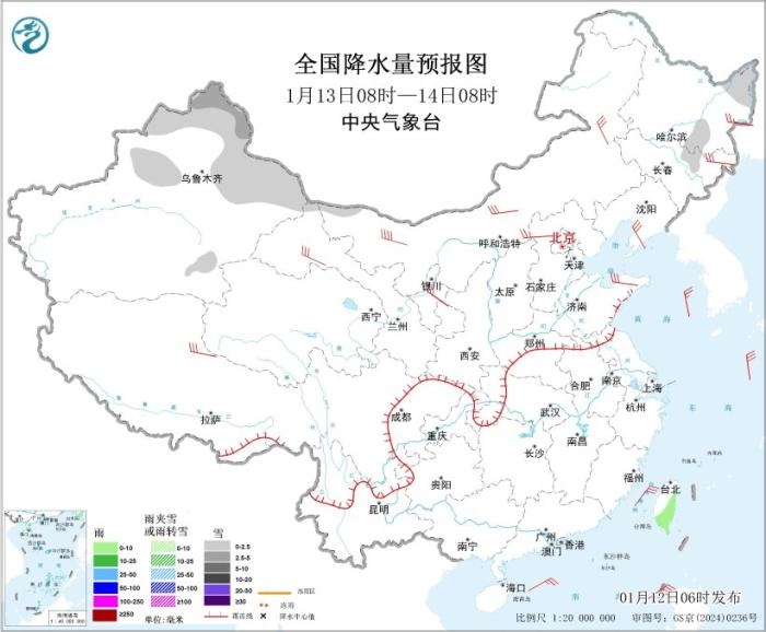 圖2 全國降水量預(yù)報圖(1月12日08時-13日08時)。圖片來源:中央氣象臺網(wǎng)站