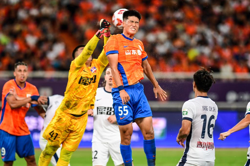 2025年7月27日,山東泰山隊(duì)球員彭嘯(右二)在比賽中爭(zhēng)頂。新華社記者 朱崢 攝
