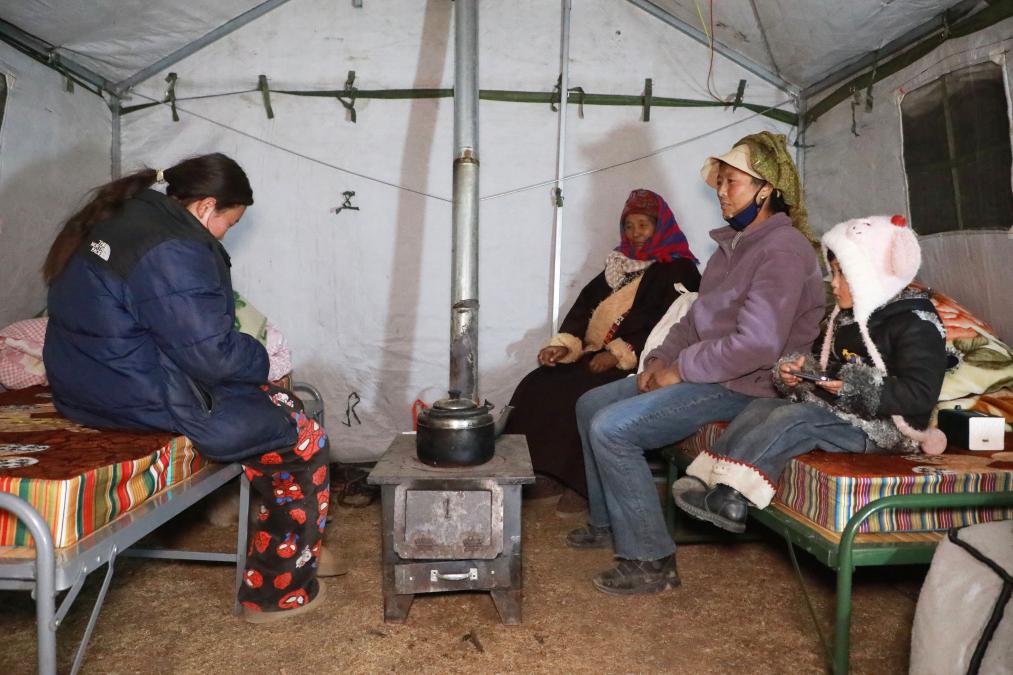 1月26日晚,在甘南州迭部縣電尕鎮(zhèn)哇曲村臨時安置點,群眾在應急帳篷內取暖休息。 (新華社記者張智敏 攝)
