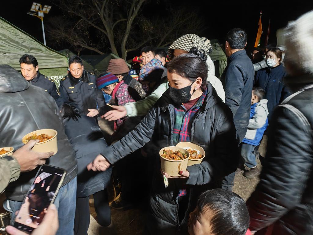 1月26日晚,在甘南州迭部縣電尕鎮(zhèn)哇曲村臨時安置點,群眾正在領取愛心餐食。(新華社記者崔翰超 攝)