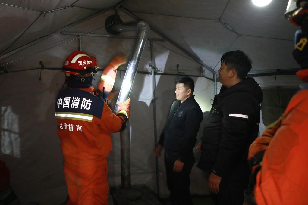 1月26日晚,在甘南州迭部縣電尕鎮(zhèn)哇曲村臨時安置點,消防救援人員在應急帳篷內幫助群眾安裝煤爐煙筒。 (新華社記者張智敏 攝)