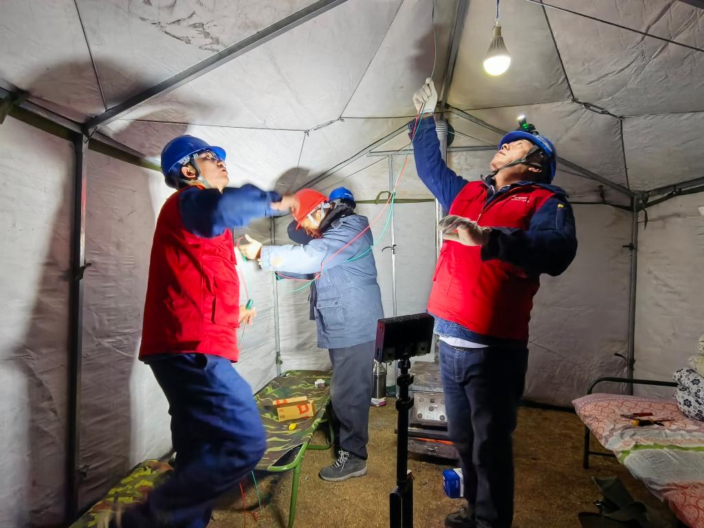 1月26日晚,國網(wǎng)甘南供電公司工作人員為臨時安置點應急帳篷接電。(國網(wǎng)甘南供電公司供圖)