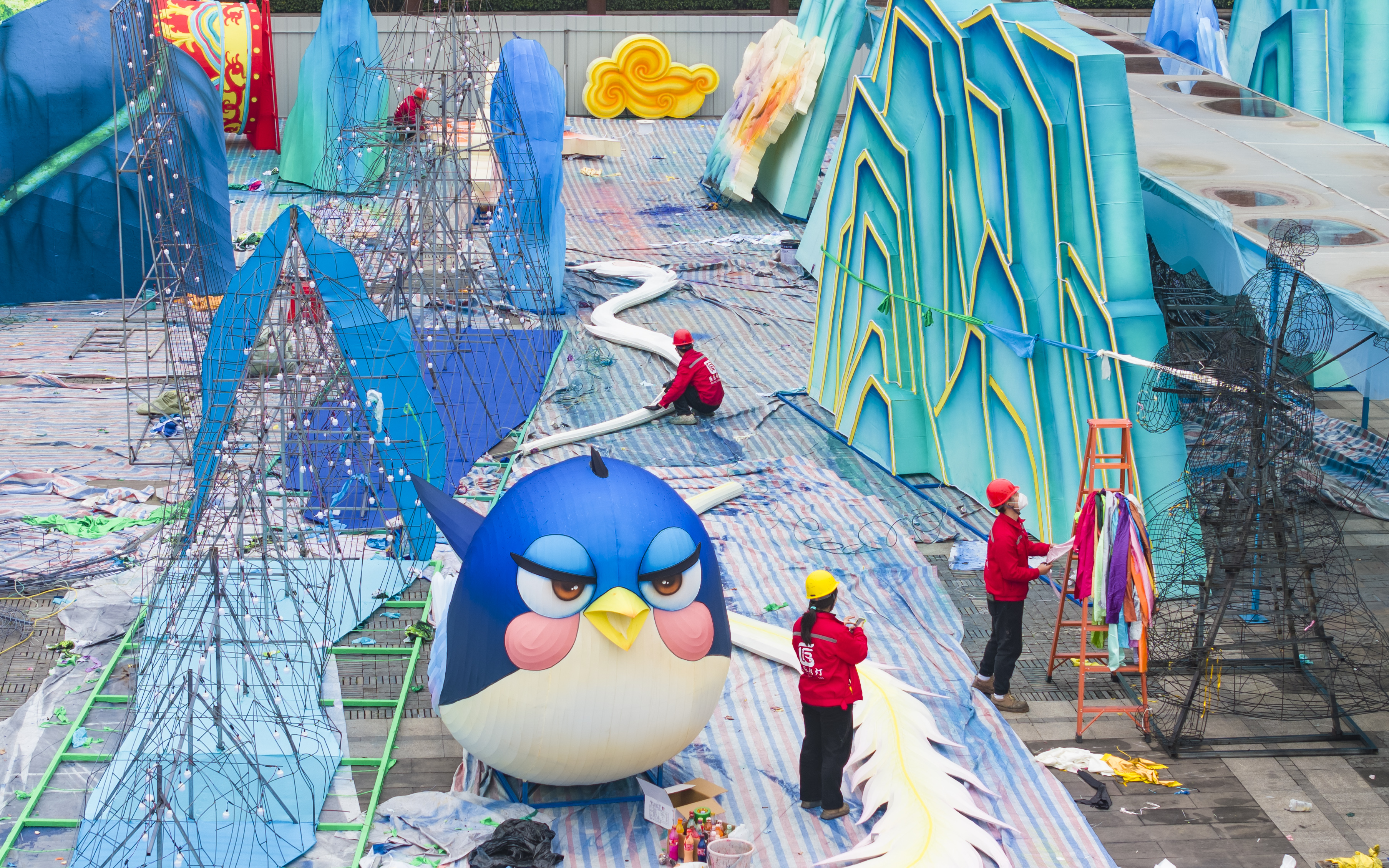 1月23日晚,自貢中華彩燈大世界火樹銀花。流光溢彩的燈海盛景,拉開了第32屆自貢國際恐龍燈會亮燈暨四川省迎春文旅促消費(fèi)活動的序幕。在200多公里外的重慶園博園龍景湖畔,焊槍滋滋作響,火星如流星濺落。自貢彩燈匠人王東瞇著眼,用鉗子彎折著一根根鐵絲,在他身后,一尊高達(dá)15米、寬約40米的《巾幗良玉》燈組巍然屹立,一臺西部最大的水上燈會正在緊鑼密鼓籌備之中。