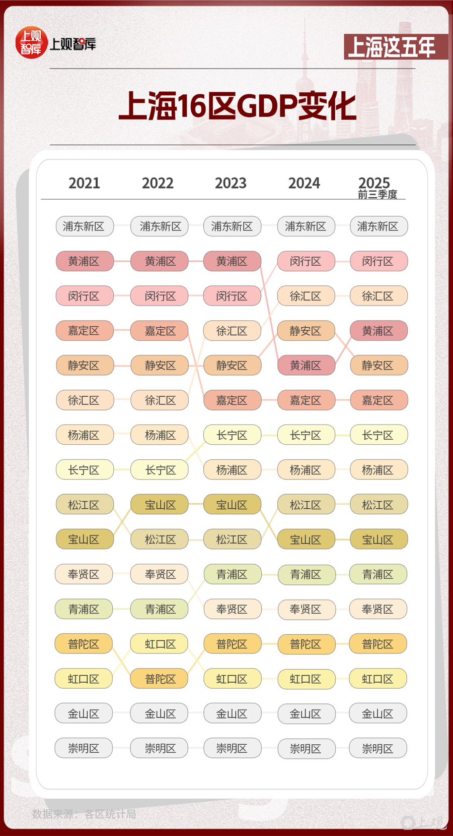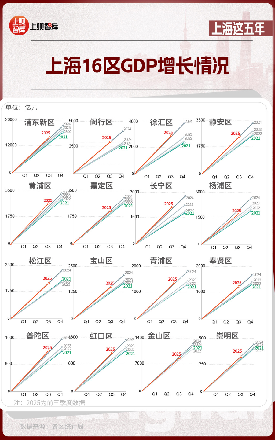 區(qū)域層面,上海16區(qū)GDP的變化,體現出從中心向多極擴散的趨勢。2021年,浦東新區(qū)GDP占全市近36%,而到了2025年,這一比重下降至約33%。其他區(qū)在這五年間,充分發(fā)揮自身優(yōu)勢,齊頭并進,為上海發(fā)展創(chuàng)造了更多增長極。