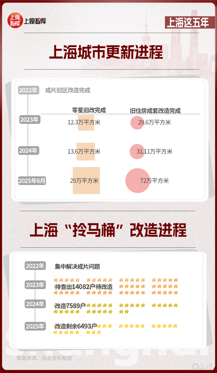 2022年,上海市成片舊區(qū)改造完成;此后,上海加力推進“兩舊一村”改造。2023年到2025年6月底,零星舊改完成約29萬平方米,舊住房成套改造完成約72萬平方米,城中村改造認定44個項目,完成老舊小區(qū)改造3910萬平方米,提前完成舊改核心任務。
