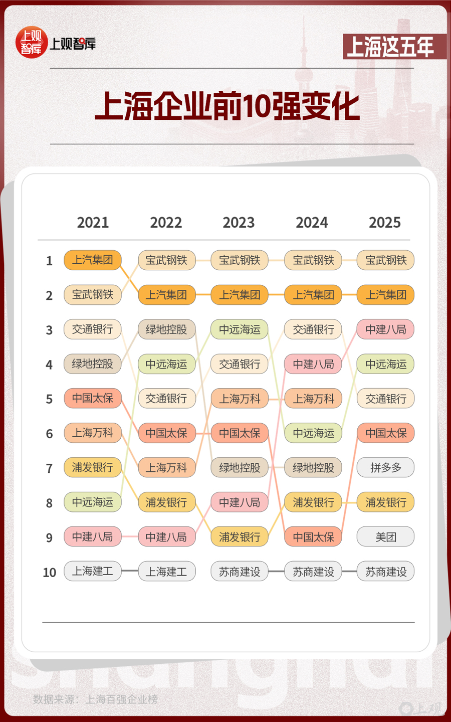這份由上海市企業(yè)聯合會、上海市企業(yè)家協會、上海市經濟團體聯合會和解放日報社共同發(fā)布的榜單,從2021年到2025年,見證了傳統企業(yè)的轉型與創(chuàng)新企業(yè)的涌現。在前10強的名單中,制造業(yè)仍然是上海產業(yè)的壓艙石,而房地產、建筑企業(yè)從2021年占比達40%,到2025年占比降低為20%?;ヂ摼W企業(yè)在2025年沖上前10強,并占據了20%的席位,亮出了上海經濟多元發(fā)展的成績單。