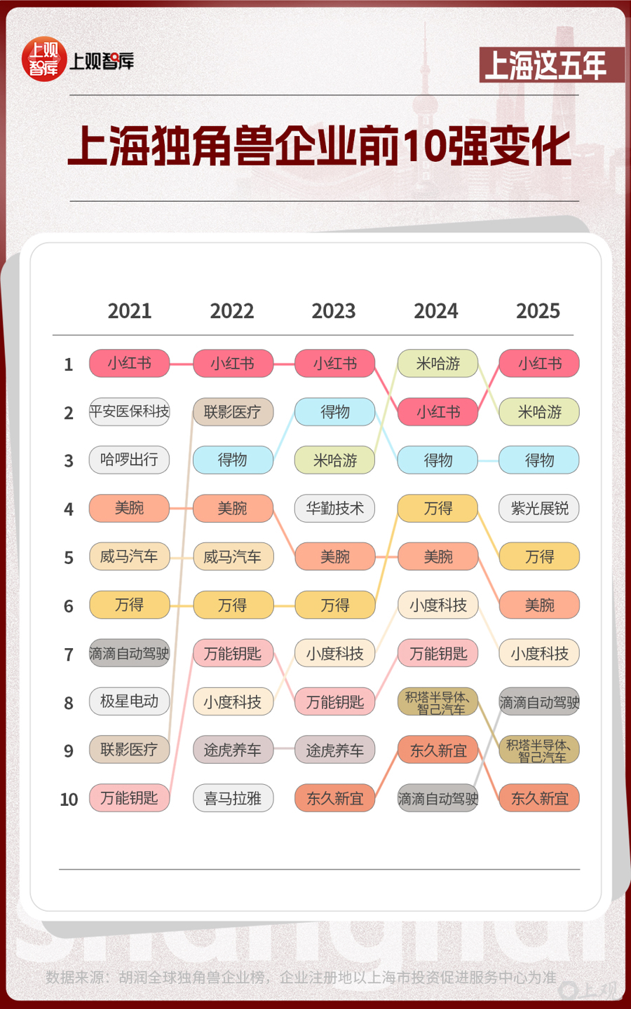前10位的上海獨角獸企業(yè),從2021年到2025年,發(fā)生了不小的改變。有的企業(yè)已經上市,如聯影醫(yī)療、華勤技術等;有的企業(yè)悄然退場;有的企業(yè)仍持續(xù)霸榜,如小紅書、米哈游、得物、美腕、萬得。獨角獸企業(yè)的變動與產業(yè)趨勢息息相關。當新能源汽車產業(yè)進入高質量發(fā)展的階段時,智己汽車接過領軍大旗;在AI芯片成為市場熱點時,積塔半導體、紫光展銳已躋身芯片新勢力代表之列。