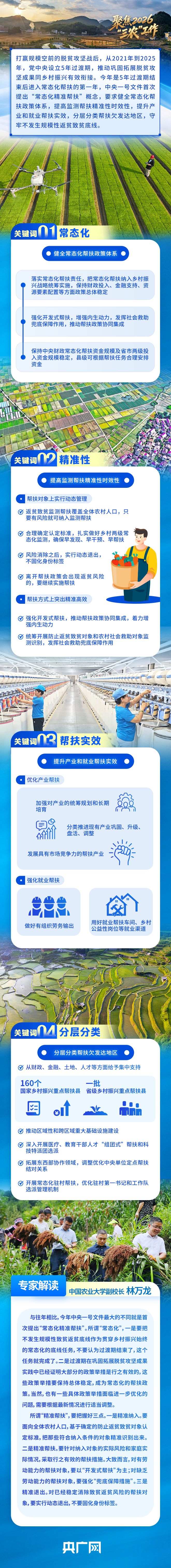 2月3日,立春節(jié)氣前夕,《中共中央 國務(wù)院關(guān)于錨定農(nóng)業(yè)農(nóng)村現(xiàn)代化 扎實推進鄉(xiāng)村全面振興的意見》向社會公布。這是黨的十八大以來,中央連續(xù)出臺的第14個指導(dǎo)“三農(nóng)”工作的一號文件,也是“十五五”時期的首個中央一號文件。今年中央一號文件首次提出實施“常態(tài)化精準幫扶”,并對此作出系統(tǒng)性部署。如何理解“常態(tài)化”?怎樣把“精準幫扶”落到實處?央廣網(wǎng)約請相關(guān)專家進行解讀。
