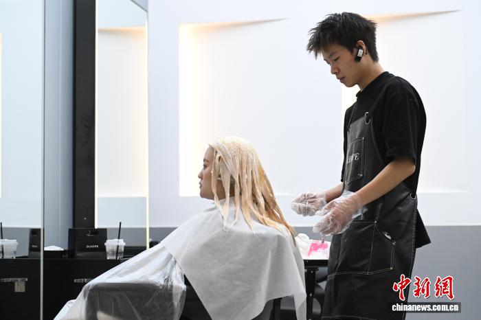 理發(fā)師為年輕顧客染發(fā)。 中新網(wǎng)記者 劉文華 攝