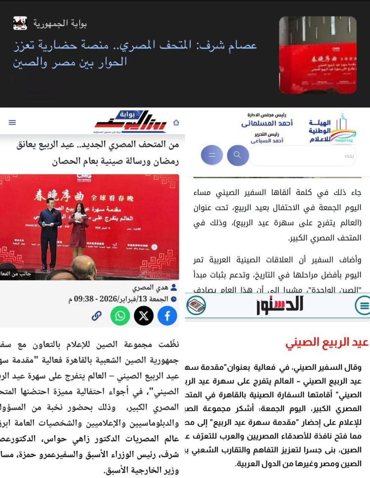 埃及國有媒體管理局官網(wǎng)以及開羅新聞電視臺、尼羅河電視臺、中東通訊社、《金字塔報》《共和國報》《今日埃及人報》《七日報》《憲章報》《魯茲優(yōu)素?!冯s志等埃主流媒體對活動進行了報道。