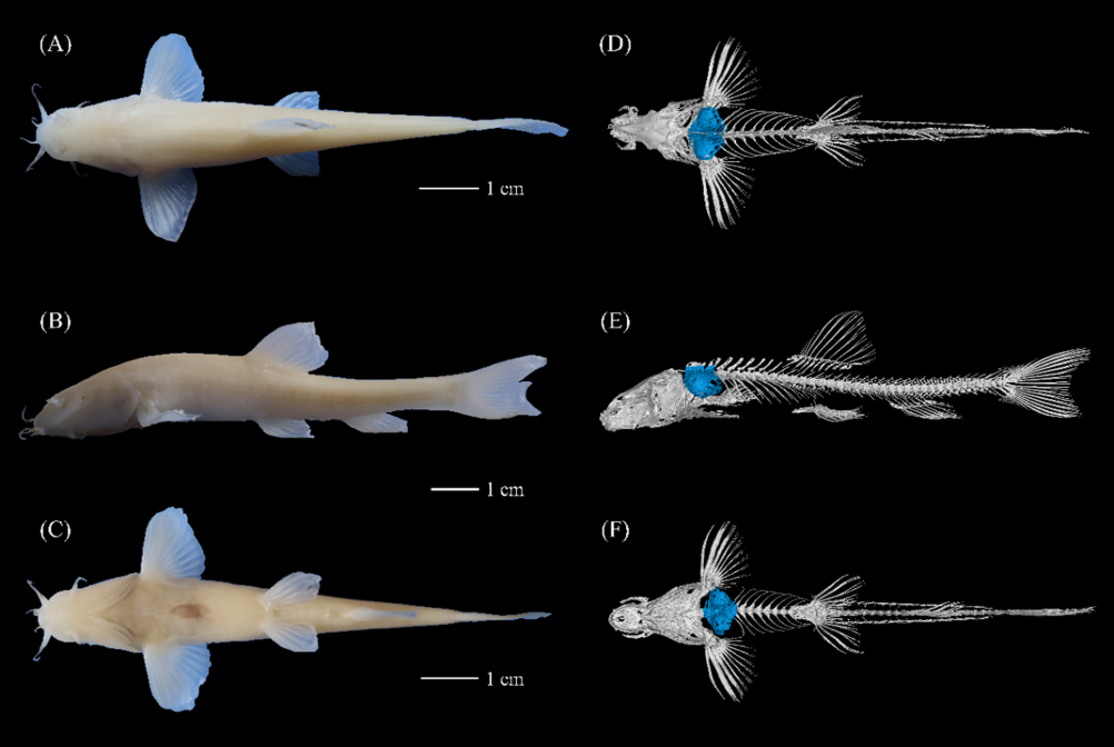 這是“納雍盲高原鰍”的外形及骨骼對(duì)比圖,研究人員從背面、側(cè)面以及腹面對(duì)這一新種的外形和內(nèi)部骨骼進(jìn)行了對(duì)比。(受訪者供圖)