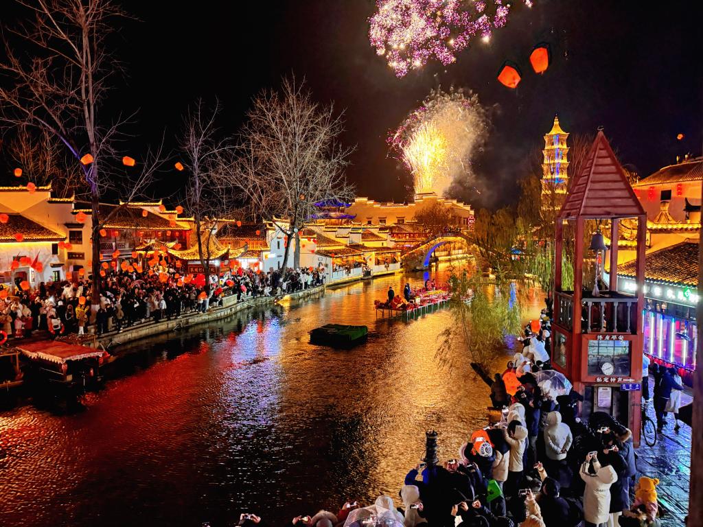 除夕夜,走進(jìn)安徽省銅陵市義安區(qū)犁橋水鎮(zhèn),只見煙花漫天、燈火璀璨,身著漢服的游客漫步街巷。