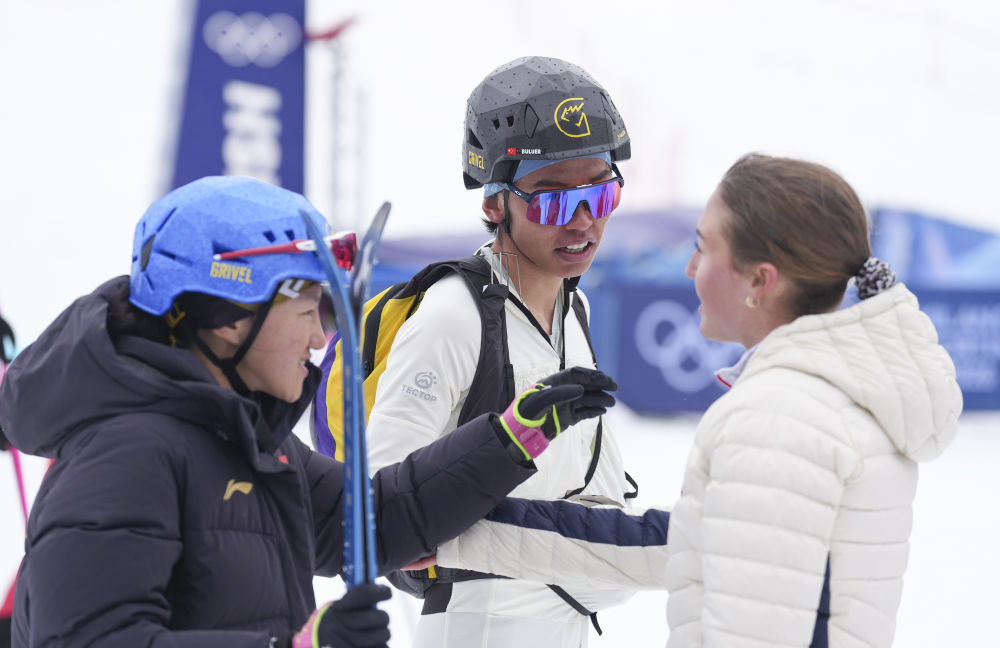 米蘭-科爾蒂納冬奧會滑雪登山混合接力比賽后,次旦玉珍(左)、布魯爾(中)與其他參賽選手交流(2026年2月21日攝)。新華社記者 胡虎虎 攝