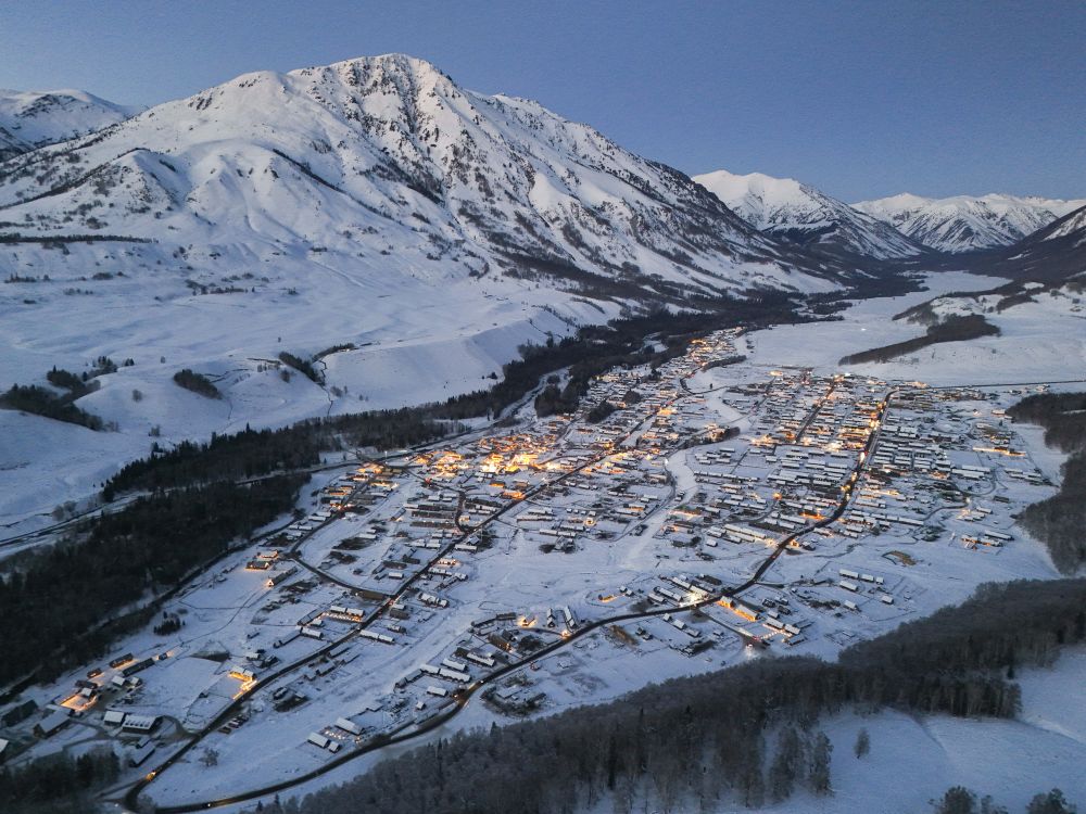 夜幕降臨,新疆阿勒泰將軍山國際滑雪度假區(qū)即將開啟夜場運(yùn)營(2025年1月24日攝,無人機(jī)照片)。新華社記者 胡虎虎 攝