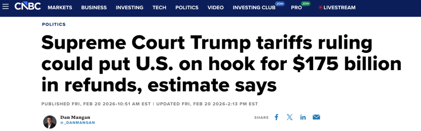 這場(chǎng)圍繞IEEPA關(guān)稅的“退稅大戰(zhàn)”,法律角度看,是最高法院把稅收權(quán)拉回國(guó)會(huì)和專門貿(mào)易法院;財(cái)政角度看,是企業(yè)與財(cái)政部圍繞上千億美元現(xiàn)金流展開的拉鋸;政治角度看,則是特朗普?qǐng)F(tuán)隊(duì)在不情愿認(rèn)輸?shù)那疤嵯?,通過(guò)話術(shù)和新關(guān)稅,把法律挫敗包裝成對(duì)內(nèi)繼續(xù)強(qiáng)硬的機(jī)會(huì)。正是在這樣的框架下,貝森特“這不是關(guān)鍵問題”的回答,恰恰暴露了關(guān)鍵所在:關(guān)稅退不退,已經(jīng)成為這屆美國(guó)政府最不愿正面回答、但又繞不開的核心問題。