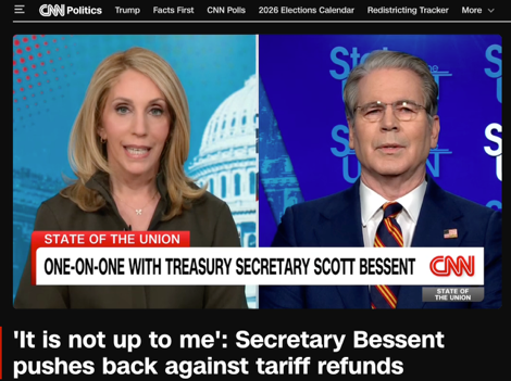 當(dāng)?shù)貢r(shí)間2月22日,美國(guó)財(cái)政部長(zhǎng)斯科特·貝森特在接受美國(guó)有線電視新聞網(wǎng)(CNN)采訪時(shí),被主持人達(dá)娜·巴什追問著一個(gè)看似直接、卻難以直接回答的問題:既然最高法院已裁定特朗普政府依據(jù)《國(guó)際緊急經(jīng)濟(jì)權(quán)力法》(IEEPA)征收的大范圍“緊急關(guān)稅”缺乏授權(quán),那么此前收上來(lái)的巨額關(guān)稅款,退不退、怎么退?