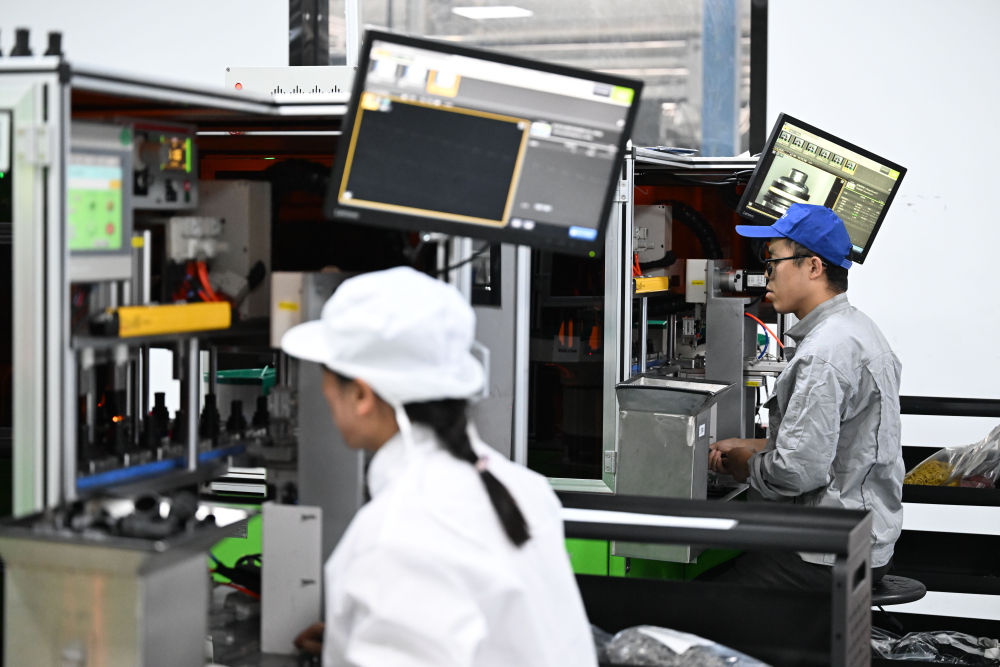 工作人員在天津鵬翎集團股份有限公司生產(chǎn)車間操作半自動生產(chǎn)設備生產(chǎn)汽車膠管接頭。新華社記者 趙子碩 攝