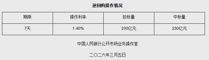 中國(guó)網(wǎng)3月5日訊 據(jù)央行網(wǎng)站消息,2026年3月5日中國(guó)人民銀行以固定利率、數(shù)量招標(biāo)方式開(kāi)展了230億元7天期逆回購(gòu)操作。具體情況如下: