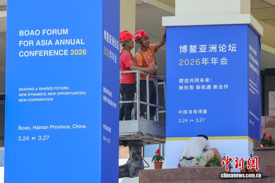 3月17日,博鰲亞洲論壇2026年年會各項籌備工作正有序推進(jìn),海南博鰲街頭的盛會氛圍日漸濃厚。以“塑造共同未來:新形勢、新機(jī)遇、新合作”為主題的博鰲亞洲論壇2026年年會將于3月24日至27日在海南博鰲召開。圖為工作人員在博鰲亞洲論壇永久會址安裝年會主題展板。中新社記者 駱云飛 攝