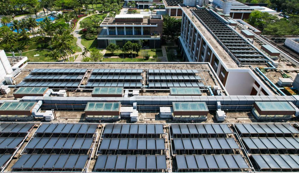 在博鰲零碳示范區(qū)拍攝的東嶼島大酒店屋頂?shù)墓夥O備(3月19日攝,無人機照片)。
