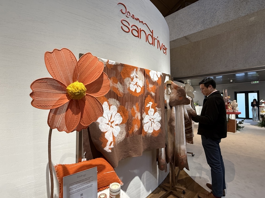 “踏花影”區(qū)域是一個五感體驗的沉浸空間。藝術(shù)羊絨品牌Sandriver沙涓現(xiàn)場還原了日喀則羊絨氆氌工坊、果洛牦牛絨氆氌工坊的織機(jī)操作,匠人以雙手穿梭,在經(jīng)緯交錯間演繹“高原的溫度”,消費者能近距離觀看從捻紗到成胚的全過程,感受這一非物質(zhì)文化遺產(chǎn)的匠心精神。沙涓品牌負(fù)責(zé)人介紹,品牌將首發(fā)羊絨睡袍系列新品、馬年主題哈尼繡系列以及羊絨艾德萊斯家居毯等作品,展現(xiàn)傳統(tǒng)工藝與當(dāng)代生活美學(xué)融合的羊絨設(shè)計。
