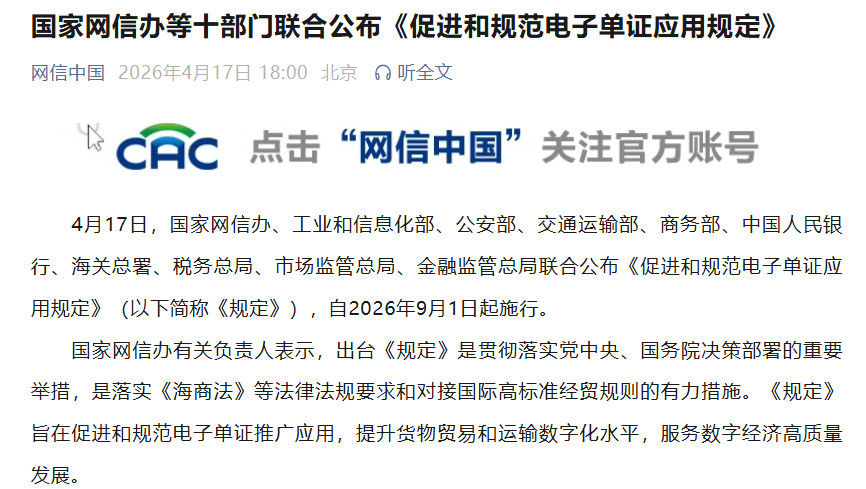中國網(wǎng)4月17日訊 據(jù)網(wǎng)信中國微信公眾號消息,4月17日,國家網(wǎng)信辦、工業(yè)和信息化部、公安部、交通運(yùn)輸部、商務(wù)部、中國人民銀行、海關(guān)總署、稅務(wù)總局、市場監(jiān)管總局、金融監(jiān)管總局聯(lián)合公布《促進(jìn)和規(guī)范電子單證應(yīng)用規(guī)定》(以下簡稱《規(guī)定》),自2026年9月1日起施行。