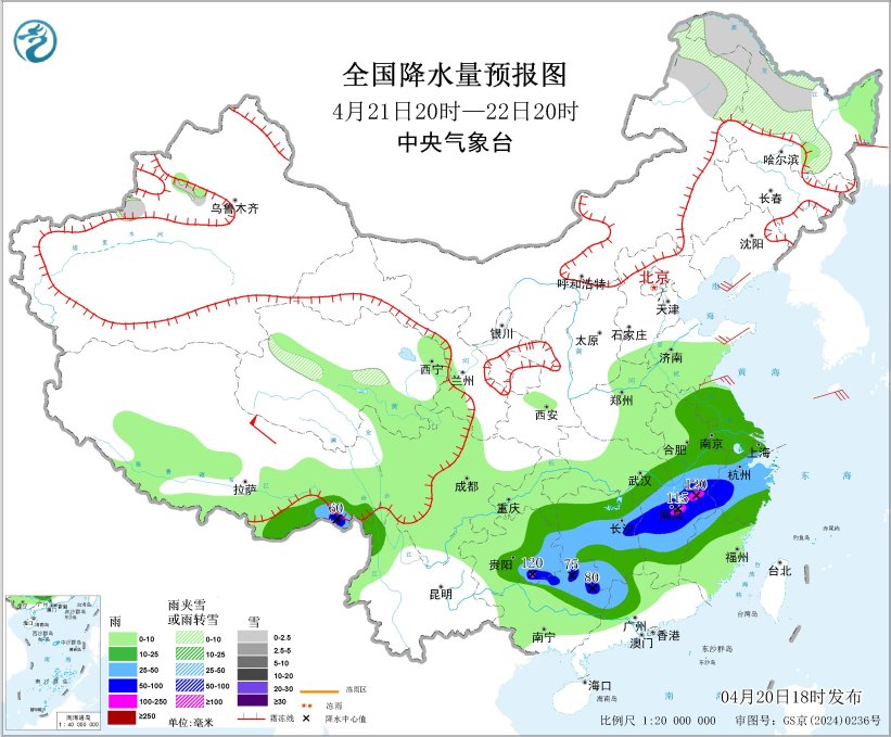4月20日20時至21日20時,內(nèi)蒙古東北部、黑龍江西北部、新疆沿天山地區(qū)、青海中部和東北部、甘肅河西等地部分地區(qū)有小雪或雨夾雪,其中,內(nèi)蒙古東北部、黑龍江西北部等地部分地區(qū)有中到大雪(5~8毫米)。西北地區(qū)東南部、黃淮西部、江漢東部、江南大部、四川盆地東北部、華南西部、北部和東南部等地部分地區(qū)有中到大雨,其中,湖南南部和東部、江西中北部、廣西東北部等地部分地區(qū)有暴雨,局地大暴雨(100~160毫米)。內(nèi)蒙古中東部、吉林、黑龍江東南部以及新疆南疆盆地、西藏北部、青海中西部等地部分地區(qū)有5~7級風(fēng),陣風(fēng)8~9級,其中內(nèi)蒙古中部、吉林中東部等地局地有8~9級風(fēng),陣風(fēng)10級以上;渤海、渤海海峽、黃海北部部分海域?qū)⒂?級、陣風(fēng)8級的大風(fēng)(見圖3)。