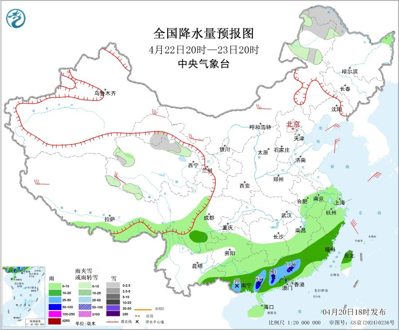 4月22日20時至23日20時,內(nèi)蒙古東北部、黑龍江西北部、青藏高原北部、甘肅河西等地部分地區(qū)有小雪或雨夾雪。江南東部和南部、華南中南部等地部分地區(qū)有中到大雨,其中,廣西東南部、廣東西部和北部等地部分地區(qū)有暴雨或大暴雨(100~110毫米)。內(nèi)蒙古大部、遼東半島、山東半島、甘肅河西、青藏高原等地部分地區(qū)有4~6級風(fēng)。東海北部海域?qū)⒂?~8級大風(fēng)、陣風(fēng)9級;黃海南部海域、東海南部海域、臺灣海峽、臺灣以東洋面、北部灣將有5~6級大風(fēng)、陣風(fēng)7級(見圖5)。