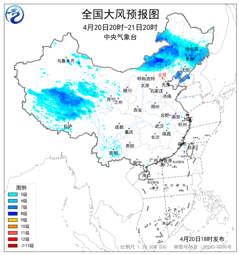 預(yù)計4月20日20時至21日20時,內(nèi)蒙古中東部、吉林、黑龍江東南部以及新疆南疆盆地、西藏北部、青海中西部等地部分地區(qū)有5~7級風(fēng),陣風(fēng)8~9級,其中內(nèi)蒙古中部、吉林中東部等地局地有8~9級風(fēng),陣風(fēng)10級以上;渤海、渤海海峽、黃海北部部分海域?qū)⒂?級、陣風(fēng)8級的大風(fēng)(見圖2)。中央氣象臺4月20日18時發(fā)布大風(fēng)藍色預(yù)警。