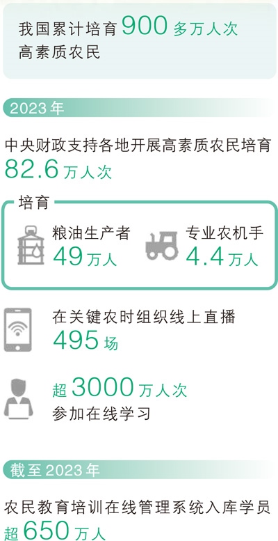 目前,我國(guó)累計(jì)培育900多萬(wàn)人次高素質(zhì)農(nóng)民。嘗鮮新技術(shù)、涉足新業(yè)態(tài),一批批高素質(zhì)農(nóng)民積極擁抱專業(yè)化、規(guī)模化、標(biāo)準(zhǔn)化的現(xiàn)代經(jīng)營(yíng)理念,為農(nóng)業(yè)農(nóng)村發(fā)展保持穩(wěn)中向好態(tài)勢(shì)提供了有力支撐。
