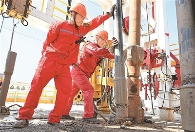 在山東省東營市勝利油田利斜856鉆井現(xiàn)場,勝利石油工程公司渤海50691鉆井隊員工進(jìn)行起下鉆施工,加快石油勘探開發(fā)步伐。王國章攝(人民視覺)