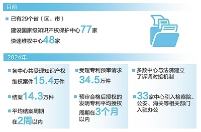 保護(hù)知識產(chǎn)權(quán)就是保護(hù)創(chuàng)新。中共中央、國務(wù)院印發(fā)的《知識產(chǎn)權(quán)強(qiáng)國建設(shè)綱要(2021—2035年)》提出,“建立完善知識產(chǎn)權(quán)仲裁、調(diào)解、公證、鑒定和維權(quán)援助體系”。目前,已有29個(gè)?。▍^(qū)、市)建設(shè)國家級知識產(chǎn)權(quán)保護(hù)中心77家、快速維權(quán)中心48家。