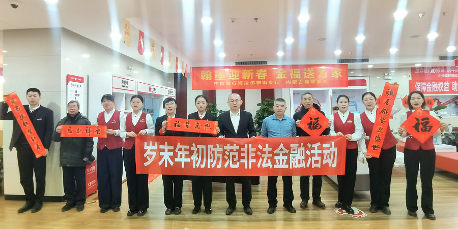 為營造喜慶祥和的新春氛圍,切實(shí)提升轄區(qū)群眾防范非法金融活動(dòng)的意識和能力,近日,中信銀行呼和浩特海拉爾東街支行聯(lián)合內(nèi)蒙古楹聯(lián)學(xué)會(huì),開展“翰墨迎新春 金福送萬家”主題活動(dòng),將傳統(tǒng)春聯(lián)文化與金融反詐知識深度融合,為市民送上一份別樣的“新春安全禮”。