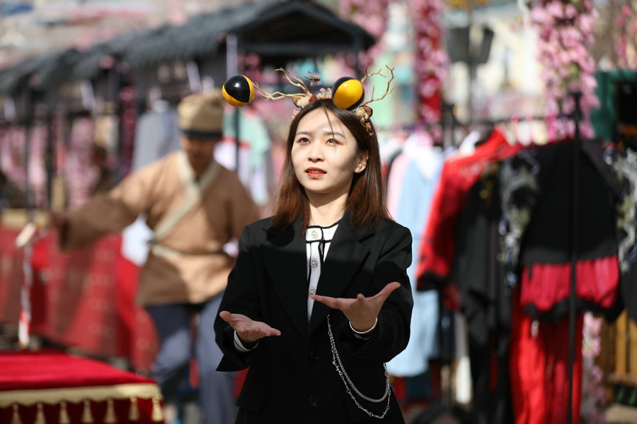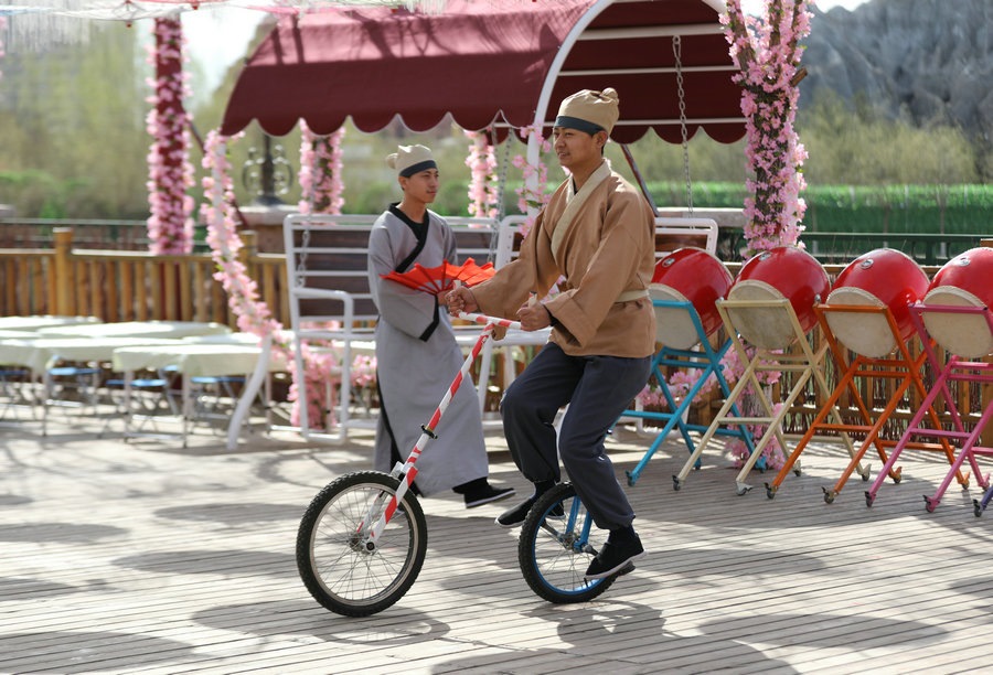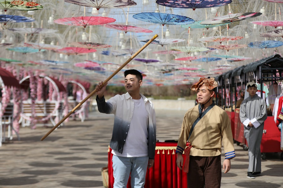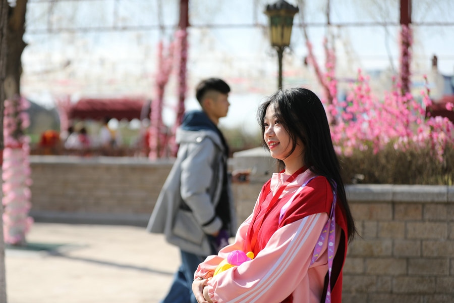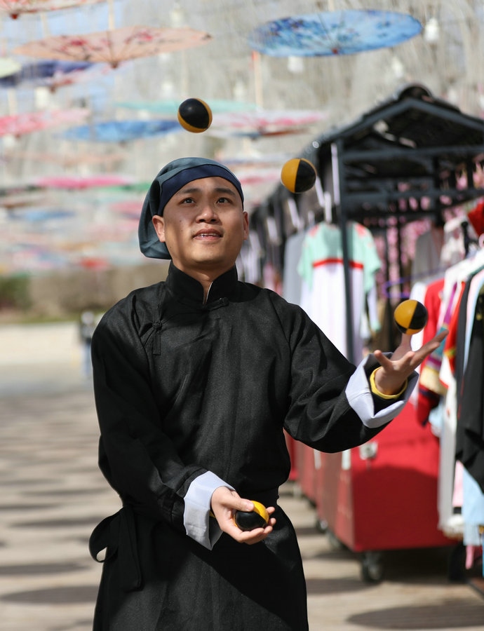 園區(qū)昔日的觀景臺,今日變身“迎春路”,花團(tuán)錦簇的搖椅,五顏六色的油紙傘,身著古典裝扮的演員,精彩絕倫的雜技表演,吸引著游客艷羨的目光,引來陣陣歡呼。蹴鞠、投壺等民俗互動游戲讓游客參與其中,各色美食,令人大快朵頤,“迎春路”上春光燦爛,儼然一片歡樂的海洋。