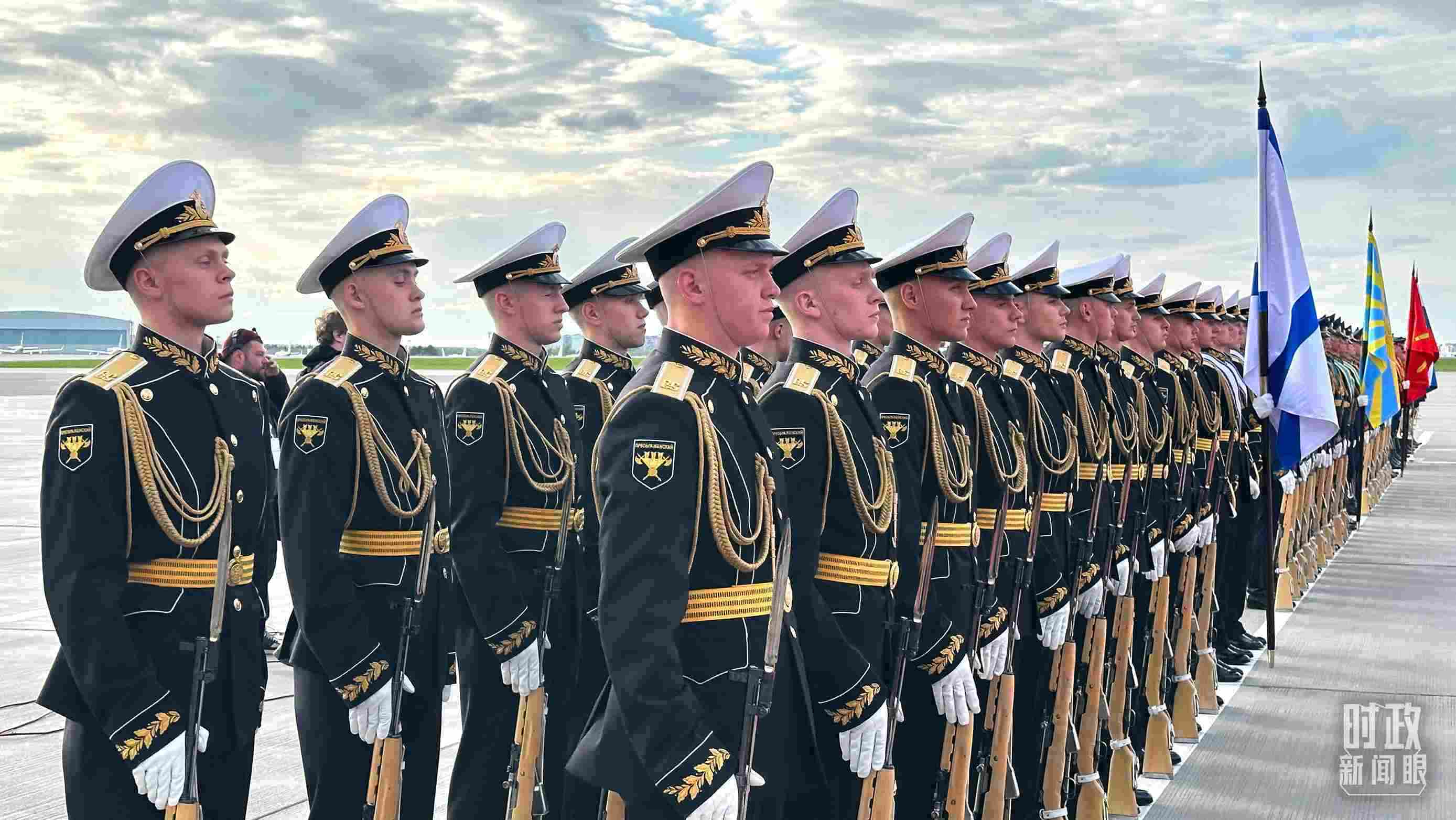 俄方在機(jī)場舉行隆重迎接儀式。軍樂團(tuán)奏中俄兩國國歌。習(xí)主席檢閱儀仗隊(duì)并觀看分列式。