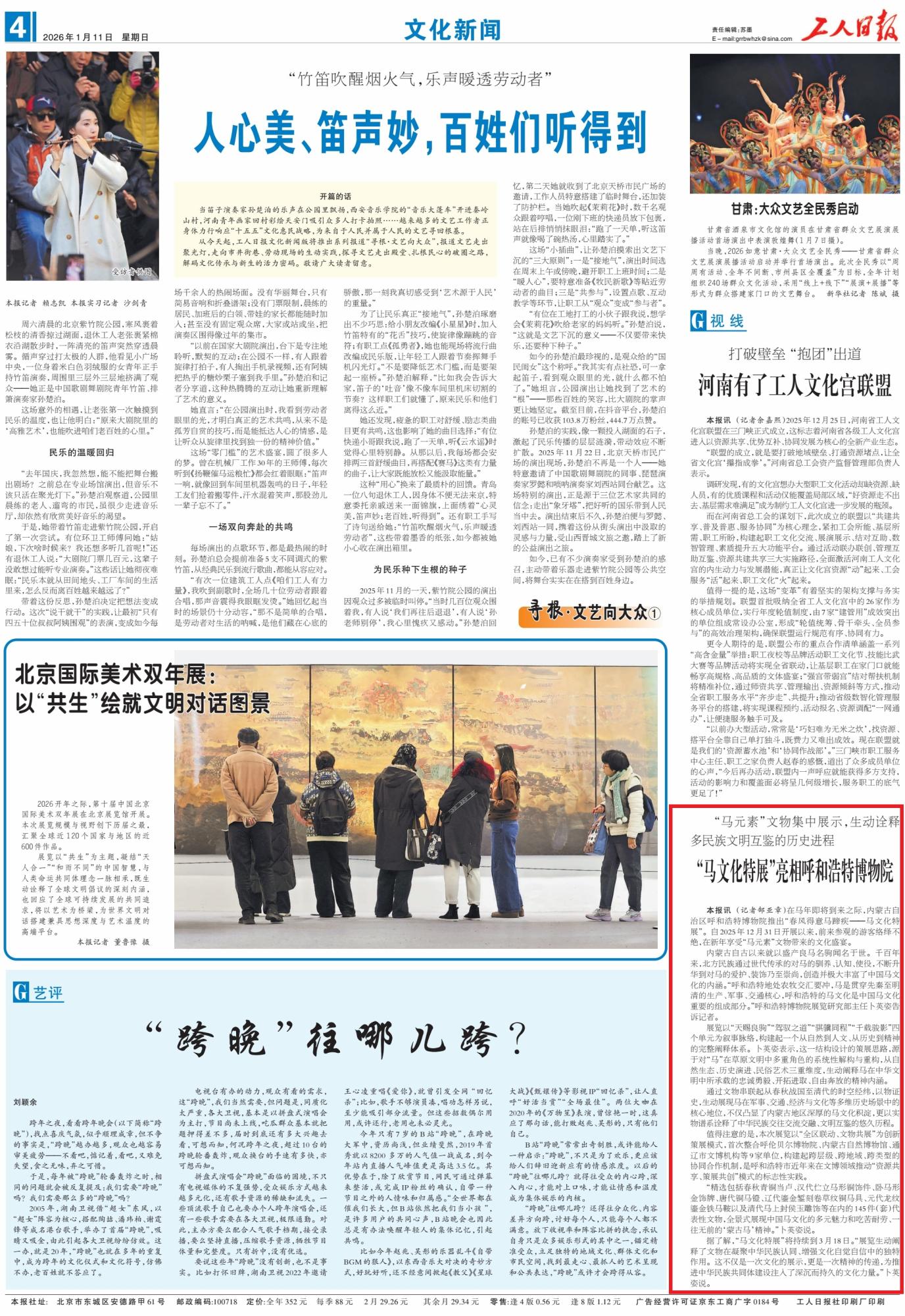 2026年1月11日,《工人日報》第4版刊發(fā)了《“馬文化特展”亮相呼和浩特博物院》的文章,報道了馬年即將到來之際,呼和浩特博物院于2025年12月31日推出“春風(fēng)得意馬蹄疾——馬文化特展”,吸引眾多游客前來領(lǐng)略馬元素文物的文化魅力,展覽將持續(xù)至3月18日。