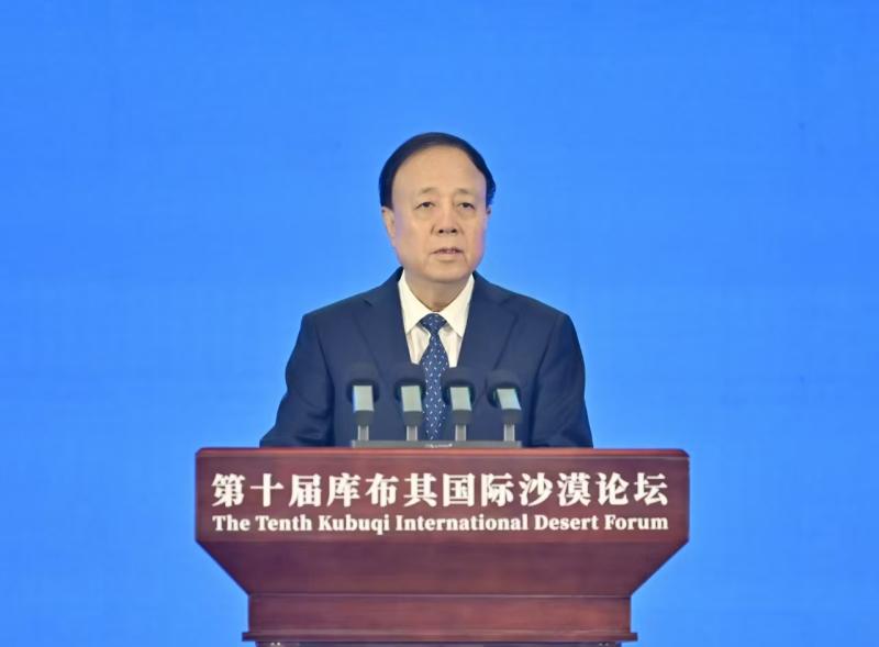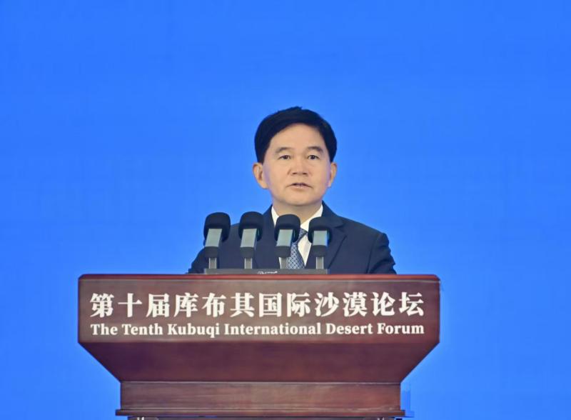 9月16日,國(guó)家林業(yè)和草原局局長(zhǎng)劉國(guó)洪在第十屆庫(kù)布其國(guó)際沙漠論壇開幕式上致辭。草原云·內(nèi)蒙古新聞網(wǎng)記者 馬建兵 攝